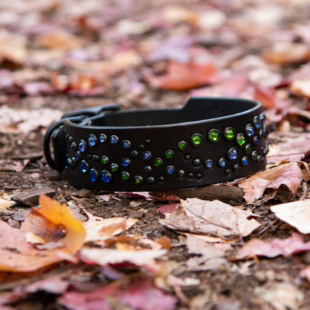 Chili Leather Dog Collar, 1.25" wide Rich Blues on Black