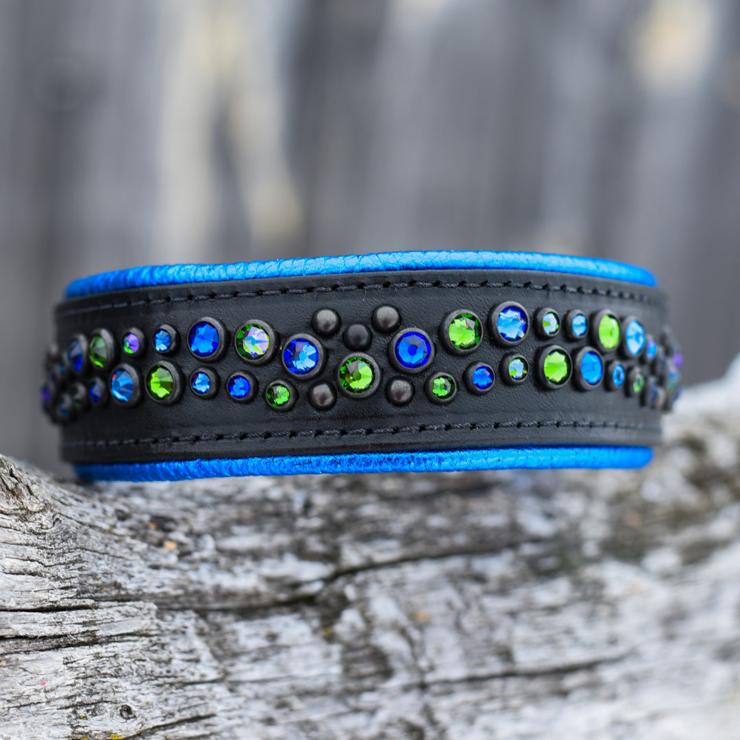 Starlight 1.5" Wide Greens on Black Leather Dog Collar, size 12"-15"