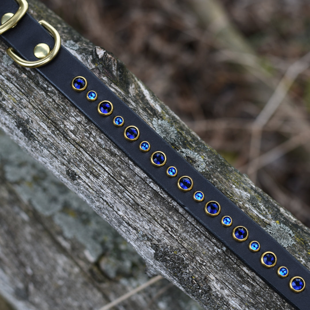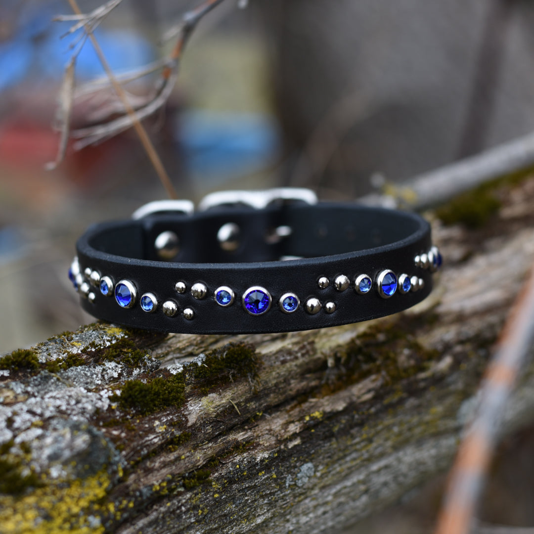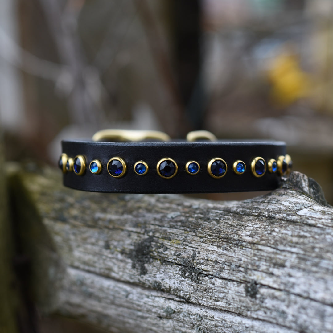 Nessie, 1.25" wide Blue Crystals on Black Leather
