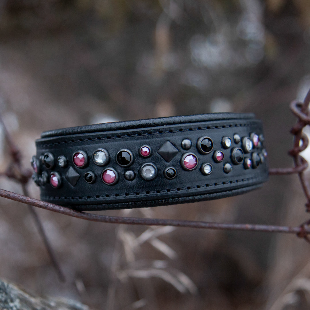 Starlight, 1.5" wide Black Leather Dog Collar, size 16"-19"