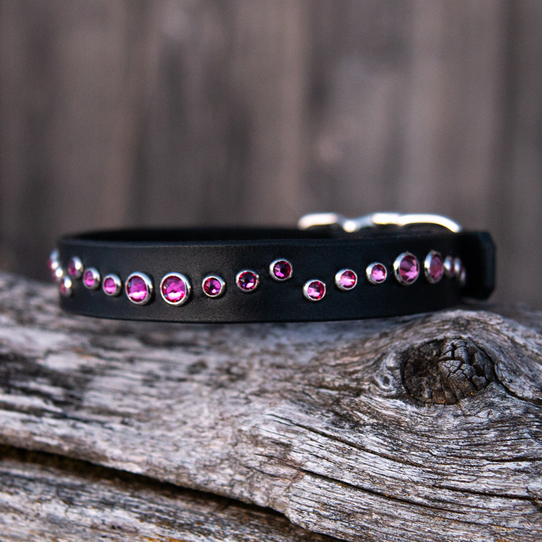 Loch, 1.5" wide Pink and Black Leather Dog Collar, size 12"-15"