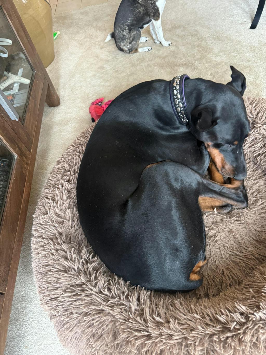 I have a few FBD collars in my collection. I was surprised at how much I liked the 3/4” Siri being it was less flashy & much thinner than the others. The simplicity makes the crystals pop against Sai’s black coat. Being an American Doberman I always thought I should go for a wider collar on her long neck. But this width ended up looking stunning. It’s evident the crystals are high end by the way that they continue to shine despite her active lifestyle.