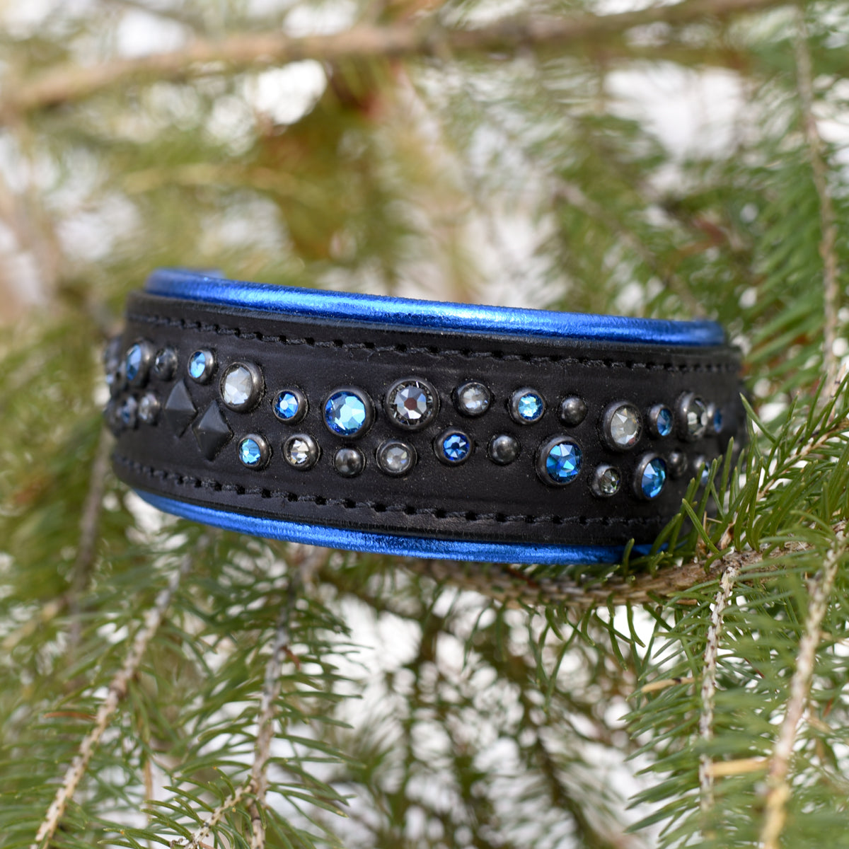 • Colour Palette: This Ready To Wear Leather Dog Collar is adorned with a colourful Blue and Grey Austrian crystals paired with black hardware and Royal Blue Metallic padding.