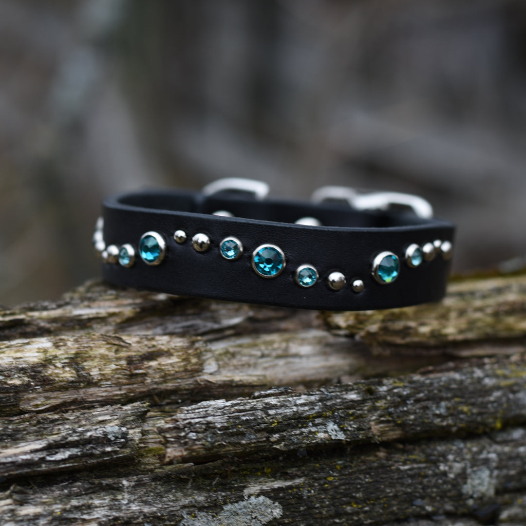 The Chili 3/4" wide Leather Collar for dogs is crafted on Black Bridle Leather.  This collar features Blue Zircon and Light Turquoise crystals in silver hardware.