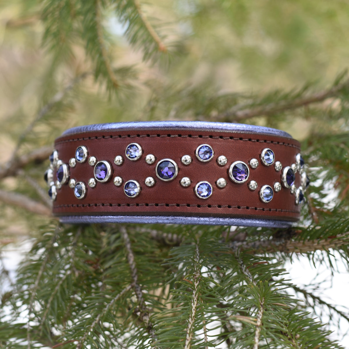 • Colour Palette: This Ready To Wear Leather Dog Collar is adorned with Purple Austrian crystals paired with Silver hardware and Lilac Metallic padding.