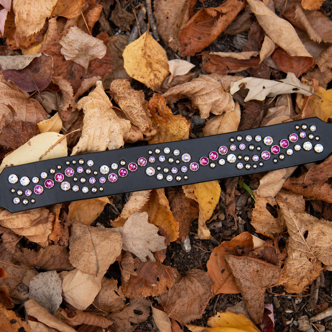 The Inverness 1.5" wide Leather Collar for dogs is crafted on Black Bridle Leather.  this collar features a pairing of pink and Crystal AB crystals in silver hardware.