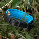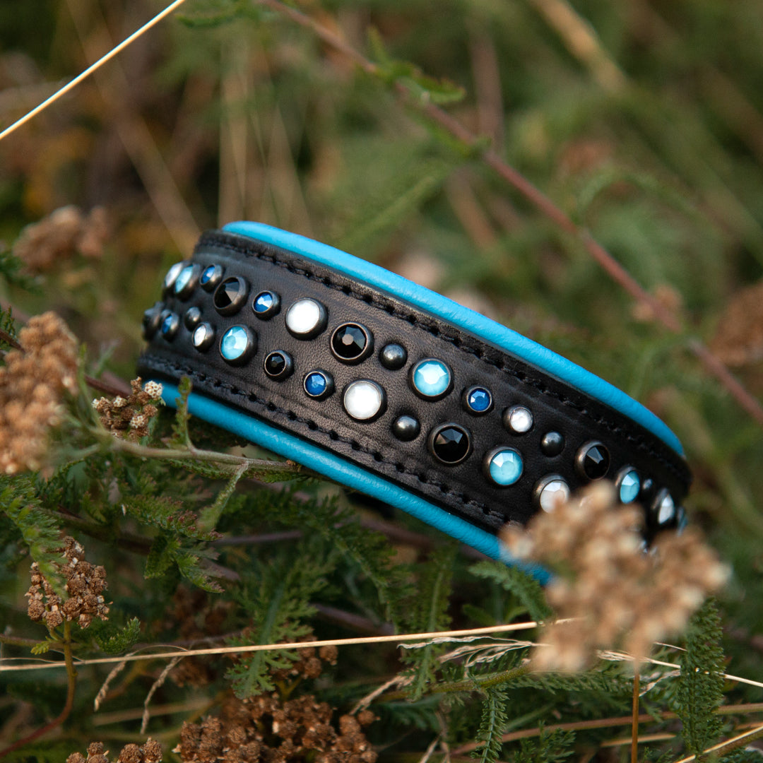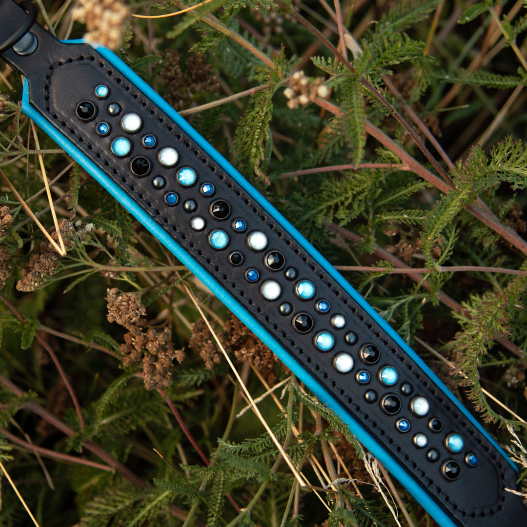 The Little Aurora is a 1.5" wide Black Leather Dog Collar with Ultra Blue comfort padding.  Featuring a medley of sky blue, black and white crystals with black hardware, the Little Aurora is perfect for Small, Medium, and Large Dogs.