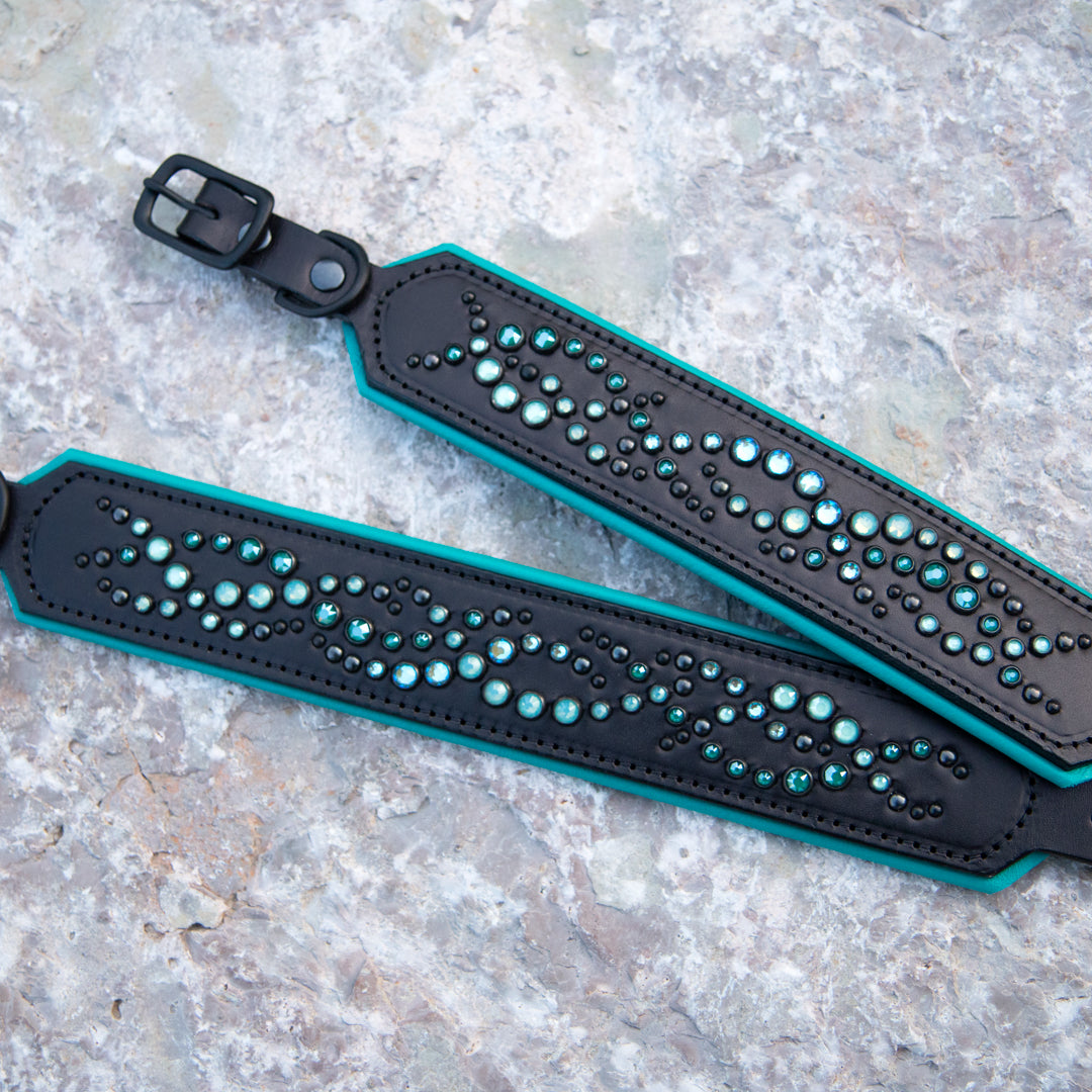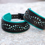 The Mini Mardi Gras 2" wide Padded Leather Dog Collar is crafted on Black English Bridle Leather and padded with Teal Padding.