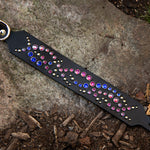 The Mini Mardi Gras 1.5" wide Leather Collar is one of our best selling collar designs. Crafted on Black Bridle Leather, this collar features pink and blue crystals in black hardware.