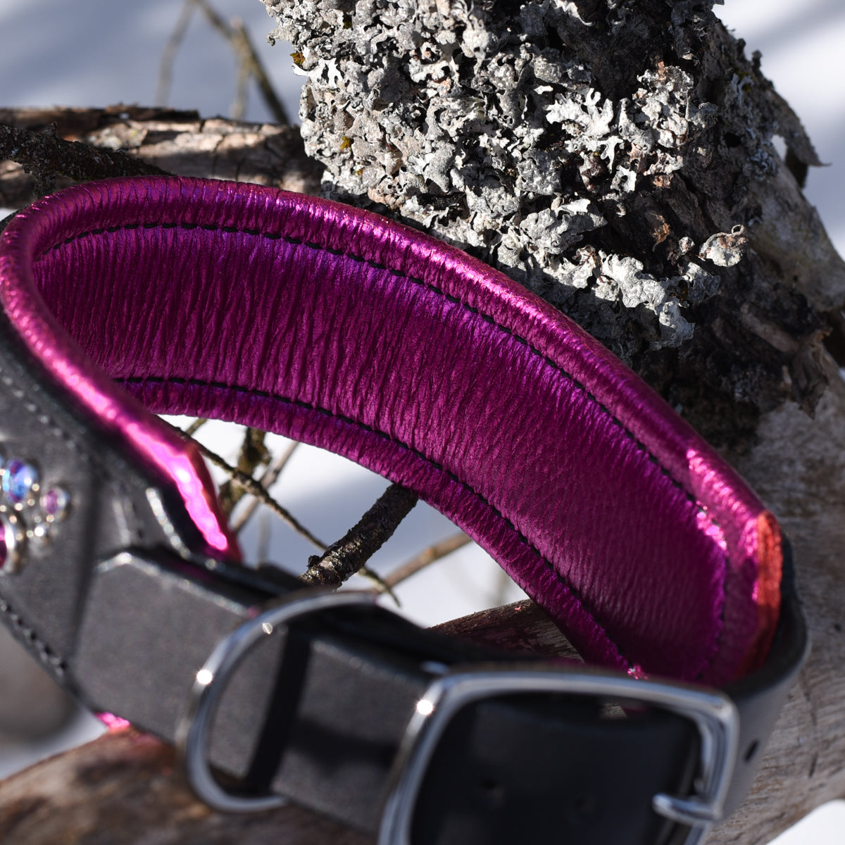 • Colour Palette: This Ready To Wear Leather Dog Collar is adorned with Fuchsia and Fuchsia Shimmer crystals paired with Silver hardware and Fuchsia Metallic padding.