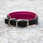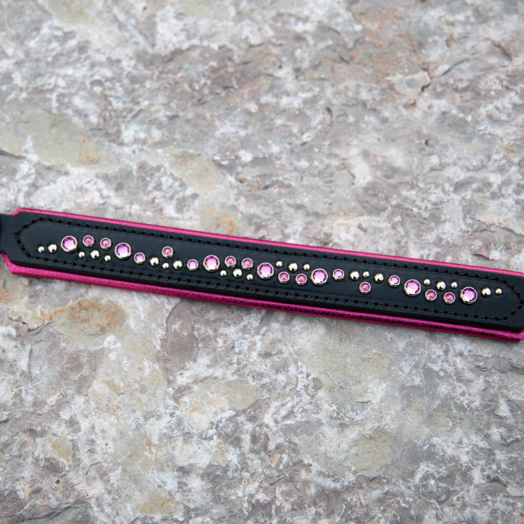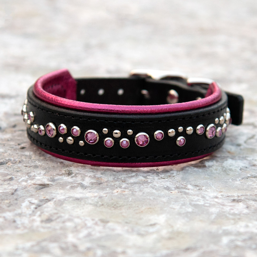 Meet the Nessie, a 1.25" wide padded Black Leather Dog Collar with Fuchsia Metallic padding.  A palette of fuchsia toned pink crystals and silver hardware complete the look.