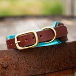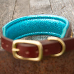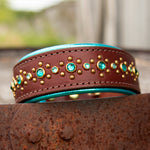 The Piper 1.5" wide Leather Collar for Dogs is crafted on Medium Brown Bridle Leather and padded with Turquoise Metallic Padding.  This brand new collar design features turquoise crystals in brass hardware.