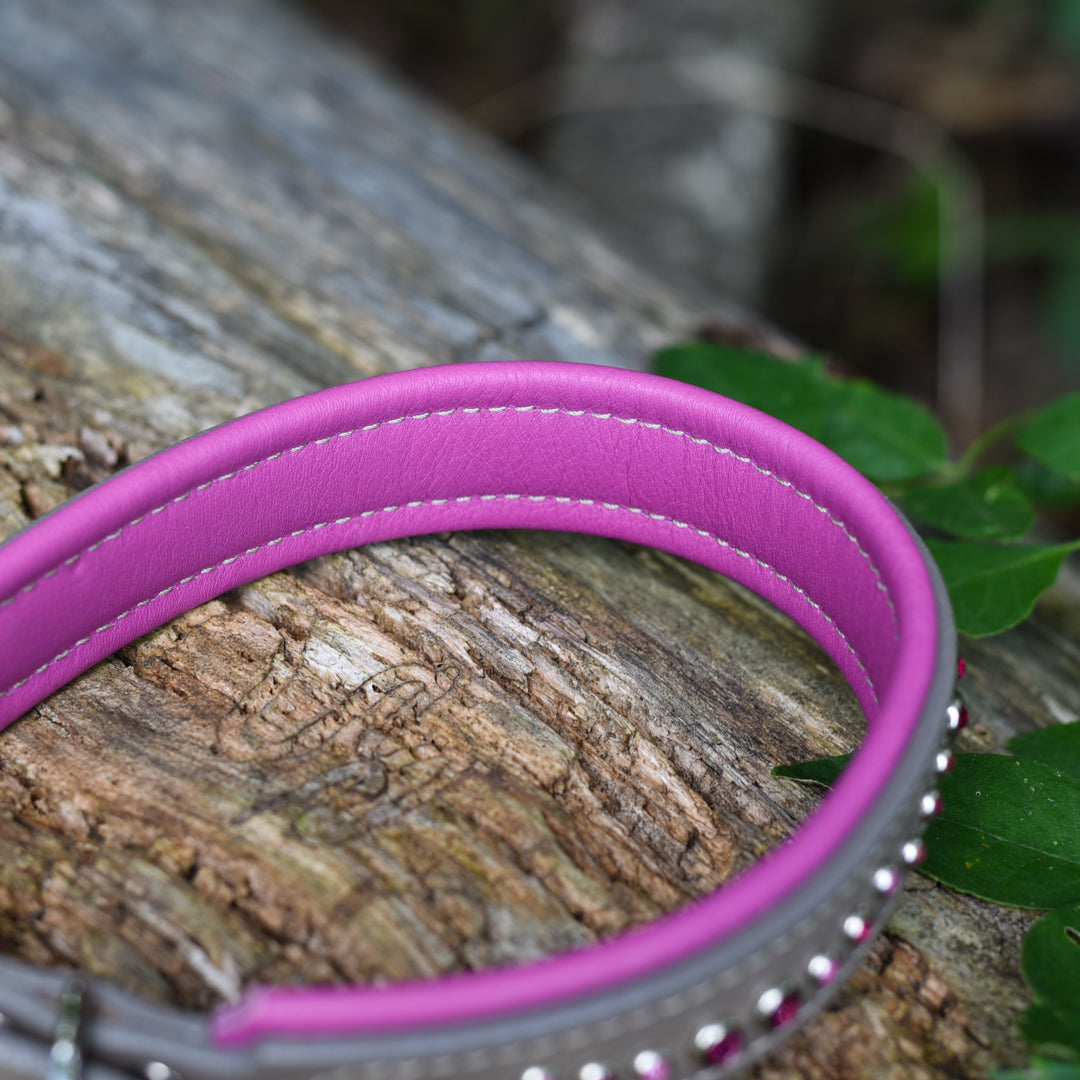 Here's your chance to own one of the last FBD Collar to be crafted on Fossil Grey Bridle Leather.  This River is a 1.25" wide padded dog collar that features Fuchsia Padding and a medley of crystals, all set in silver hardware.