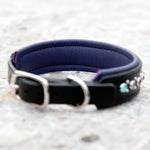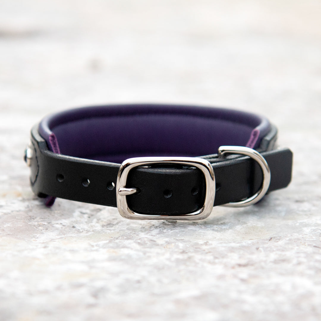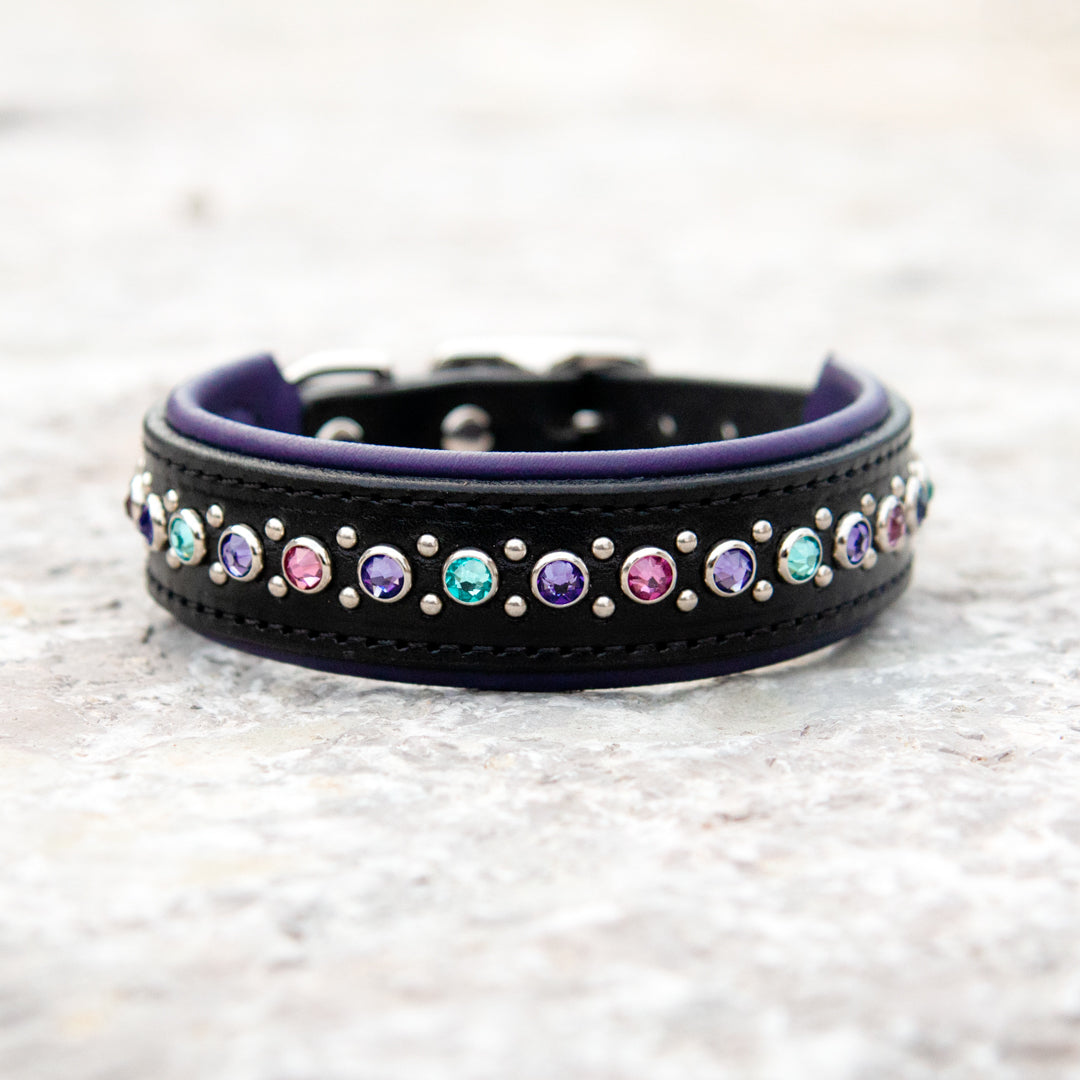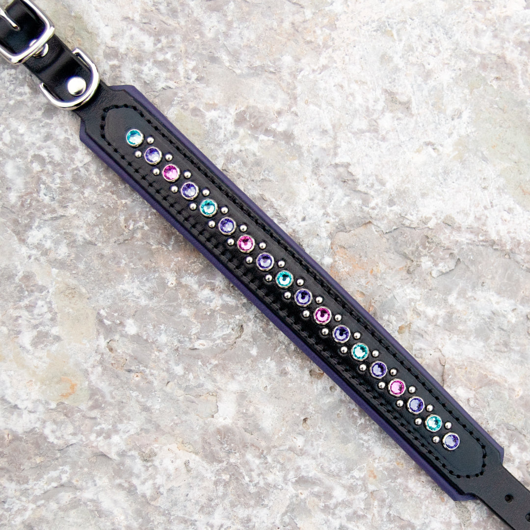 The Silas, a 1.25" wide padded Black Leather Dog Collar with Purple padding.  Crafted on Black Latigo Leather, Purple, Pink and Teal crystals paired with silver hardware complete the look.