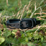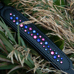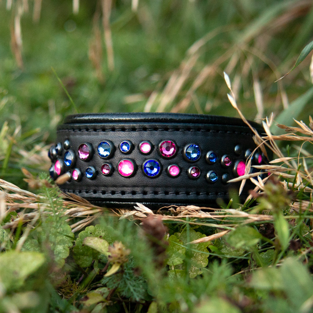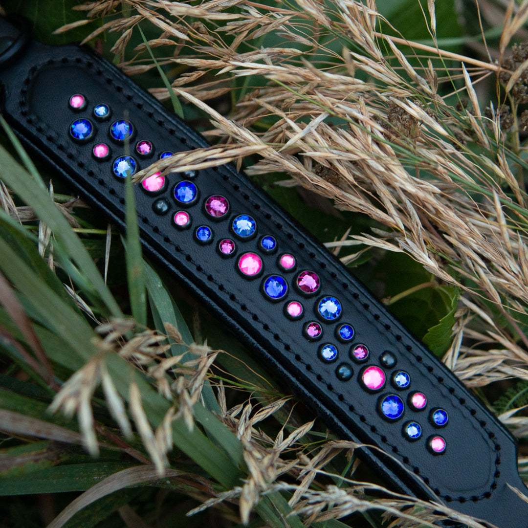 The Starlight 1.5" wide Padded Leather Collar for dogs is crafted on Black Bridle Leather. Padded with Black Leather Padding, this collar features a medley of pink and blue crystals in black hardware.