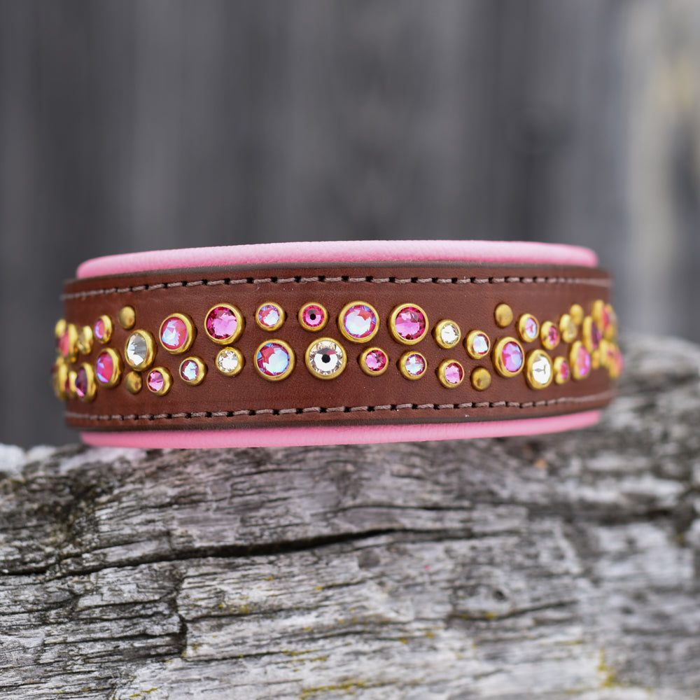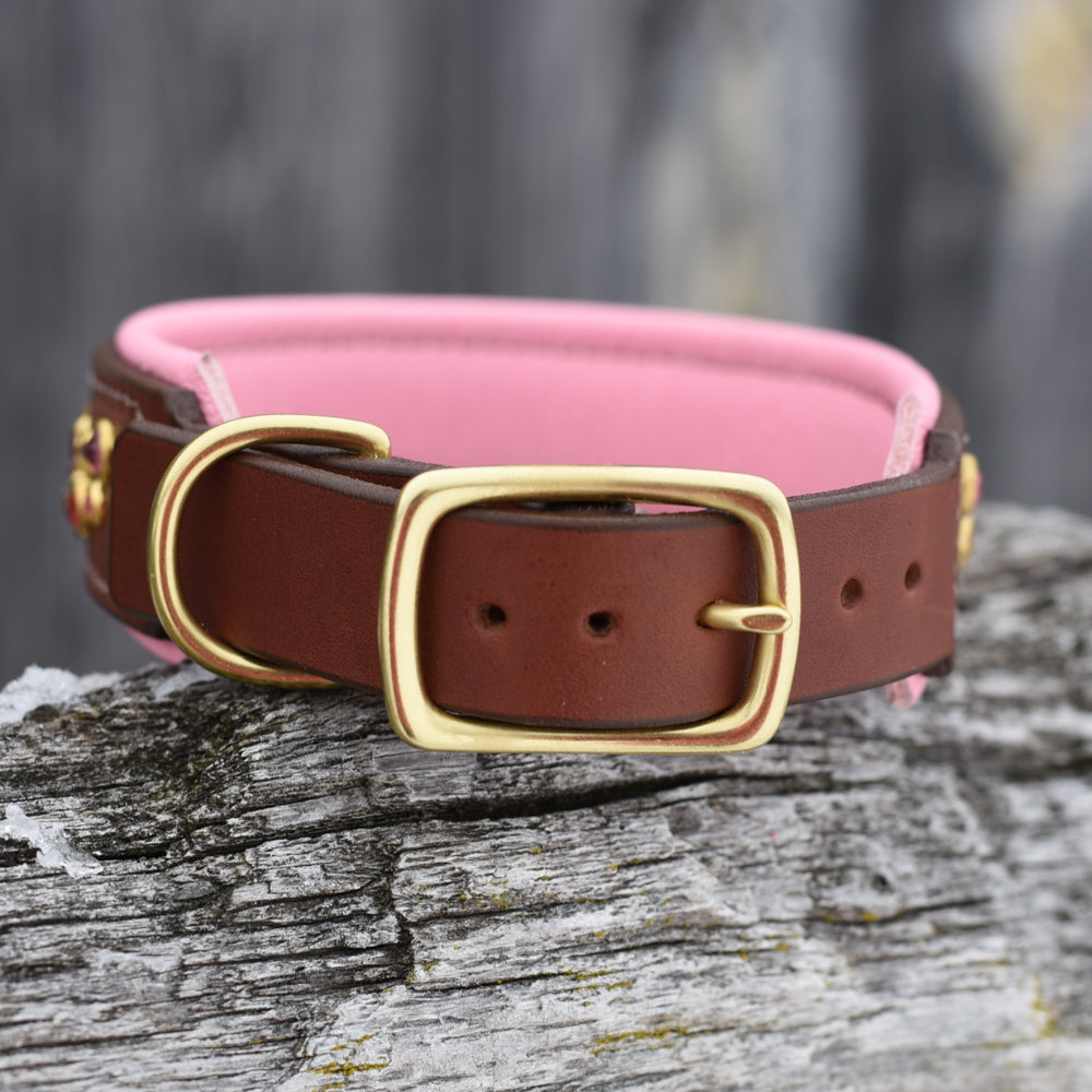 This 1.5" wide Medium Brown leather dog collar features a medley of pink crystals paired with light pink padding and brass hardware.  A soft sweet palette, perfect for a Princess.