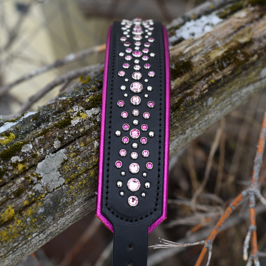 Built on our 2" wide signature padded design, the Stellar features a constellation-inspired crystal layout that catches light from every angle. The sample shown pairs black leather with vibrant Fuchsia Metallic padding and pink crystals, but your collar doesn’t have to look like this one. As with all FBD customs, every detail is yours to choose—leather colour, padding, hardware, and crystal colours.