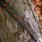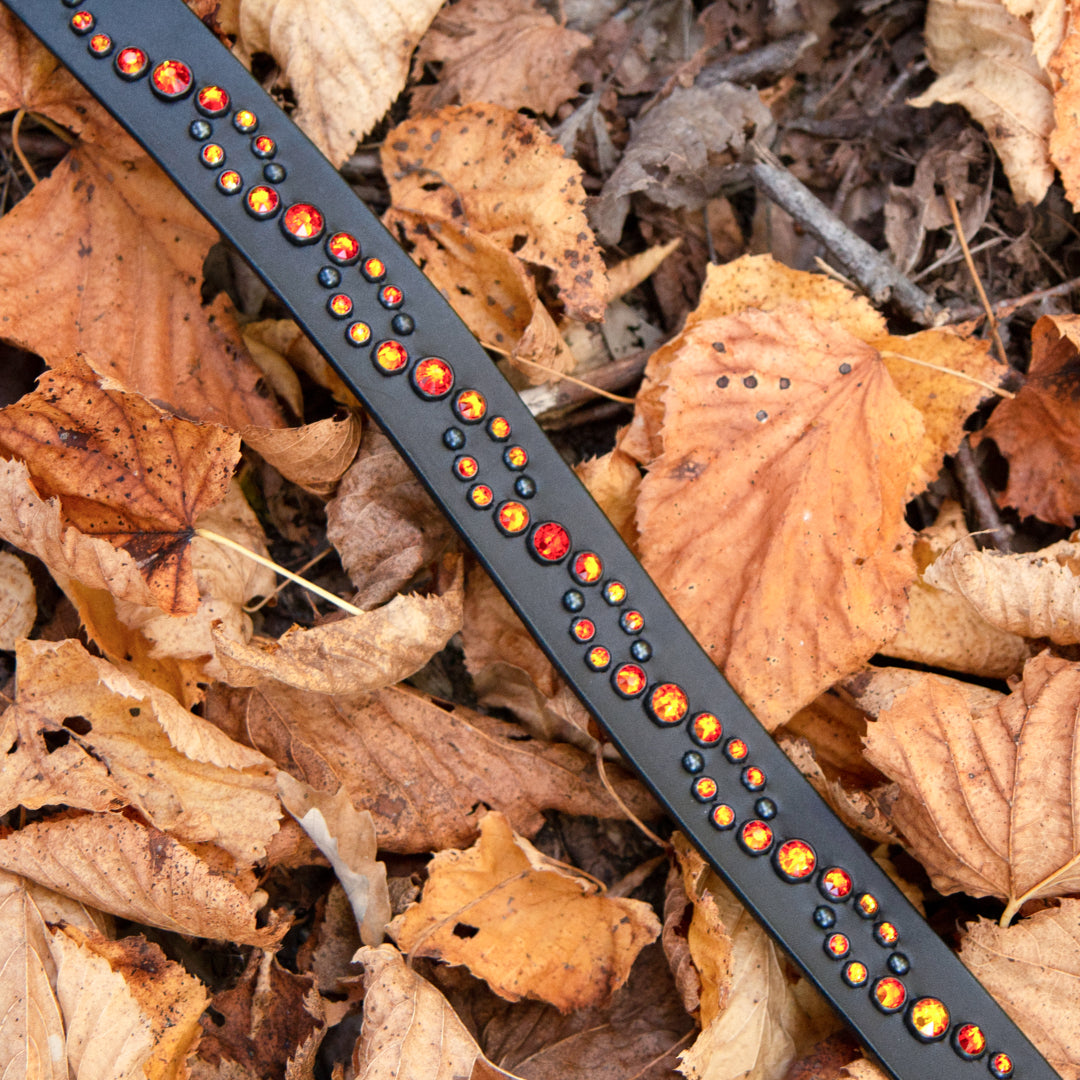 The Wave 1.25" wide Leather Collar for dogs is crafted on Black Bridle Leather.  this collar features a medley of orange crystals in black hardware.