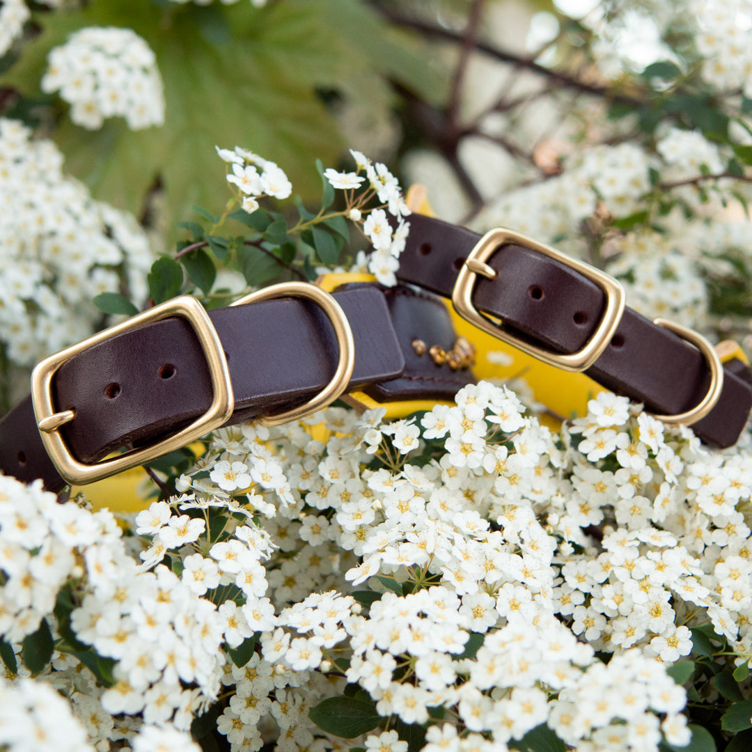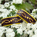 The Wave 1.5" wide Padded Leather Dog Collar is crafted on Dark Brown English Bridle Leather and padded with Lemon Yellow Padding.  Handmade in Canada, this collar features Yellow hued crystals paired with brass hardware.  It is an ideal collar for small and medium dogs.