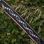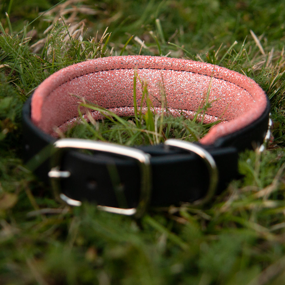 The Wave is a 1.5" wide Black Leather Dog Collar that features Peach Sparkle Padding.  This handmade collar is a (very) limited run collar thanks to that extra sparkle.